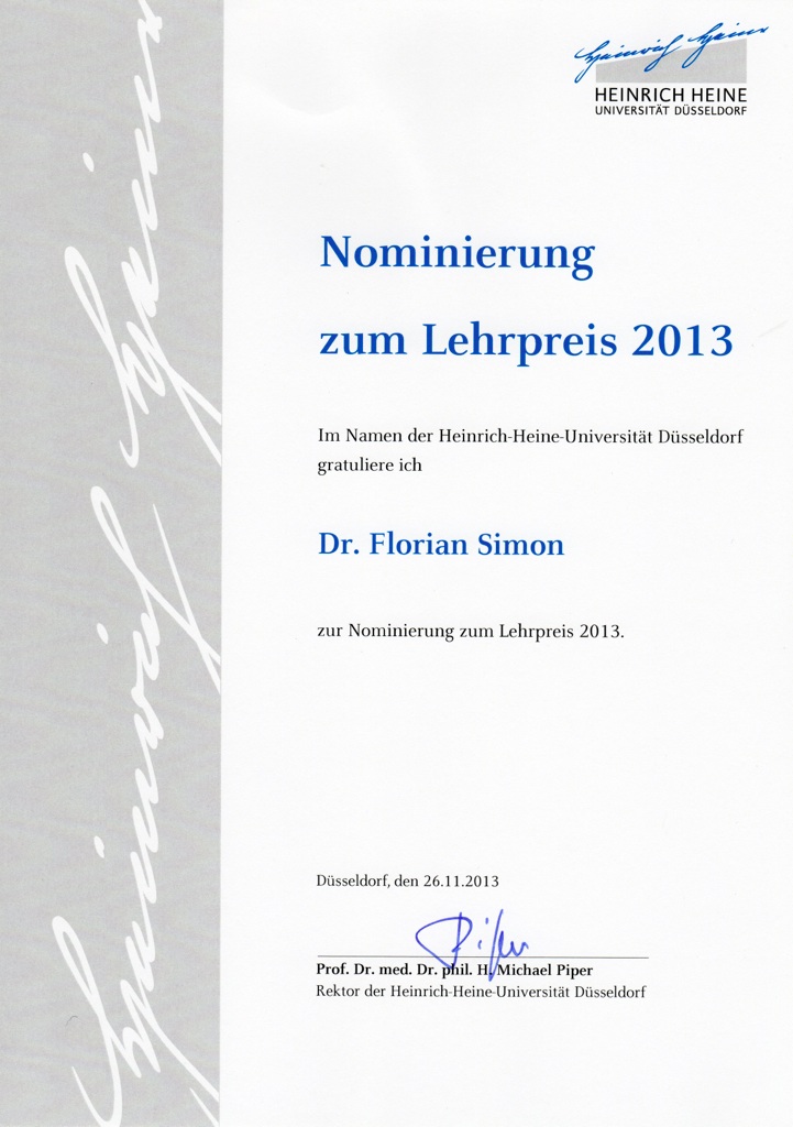 | 05/2014 | Es freut uns mitteilen zu können, dass Hr. Dr. Simon (Lehrbeauftragter unserer Klinik) für den Lehrpreis 2013 der Universität Düsseldorf nominiert wurde |