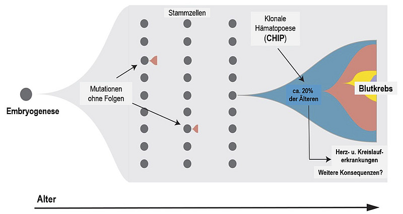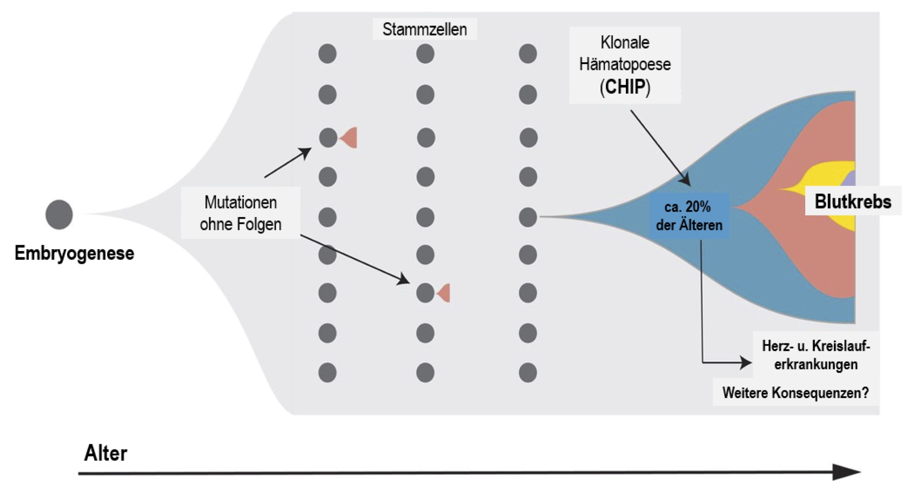 Erworbene Veränderungen in Genen sind ein Merkmal des Alterungsprozesses. Von solchen Mutationen sind auch die Stammzellen des Blutes betroffen. Wenn hierdurch eine Blutstammzelle einen abnormen Wachstumsvorteil erlangt, wird das Phänomen als CHIP bezeichnet (clonal hematopoiesis of indeterminate potential). Etwa 10-20% der über 70-Jährigen sind davon betroffen.