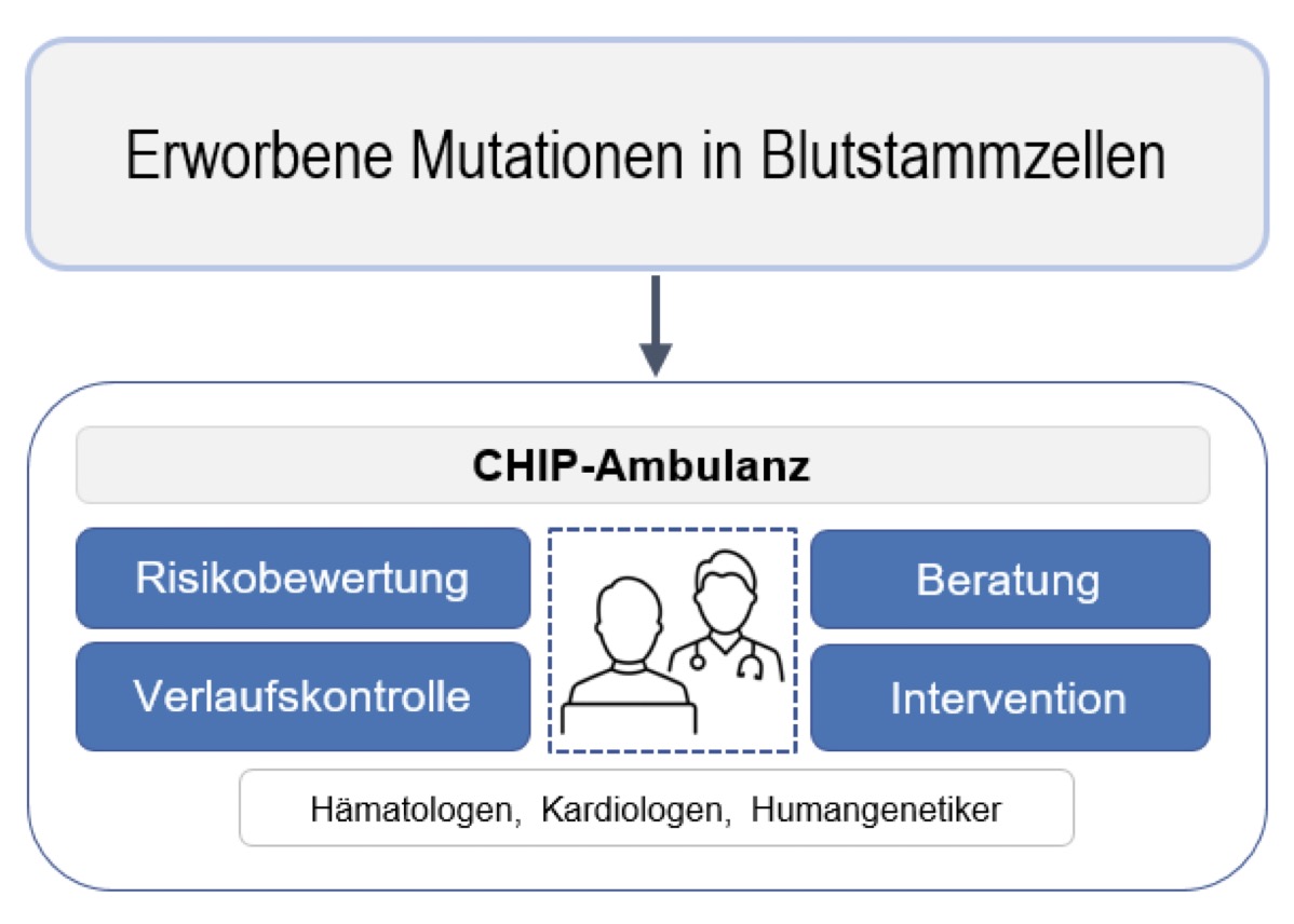 Mit der CHIP-Ambulanz (CH outpatient clinic) soll eine hämatologisch-kardiologische Spezialsprechstunde etabliert werden, in der PatientInnen mit CHIP identifiziert und beraten werden. Mitarbeiter sollen für die genetische Beratung zum Risikomanagement geschult werden, und ein benutzerfreundliches digitales System zur Patienteninformation und -befragung soll etabliert werden.