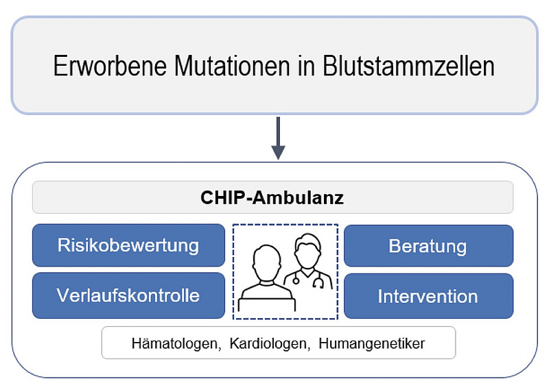 Mit zunehmendem Alter steigt die Häufigkeit erworbener (somatischer) Mutationen. Treten solche Mutationen in hämatopoetischen Stammzellen auf, spricht man von klonaler Hämatopoese von unbestimmtem Potenzial (CHIP). CHIP erhöht das Risiko für Herzkreislauferkrankungen um das 2-fache, für bösartige Blutkrebserkrankungen wie AML oder MDS sogar um das 10-fache. Ebenfalls treten chronische Lungenentzündungen, Diabetes, Insulinresistenz, Gicht und Osteoporose vermehrt auf. Die CH outpatient clinic bietet betroffenen PatientInnen durch enge Zusammenarbeit von Hämatologen, Kardiologen und Humangenetikern eine umfangreiche Risikobewertung, Beratung, regelmäßige Verlaufskontrollen sowie Interventionsmaßnahmen.