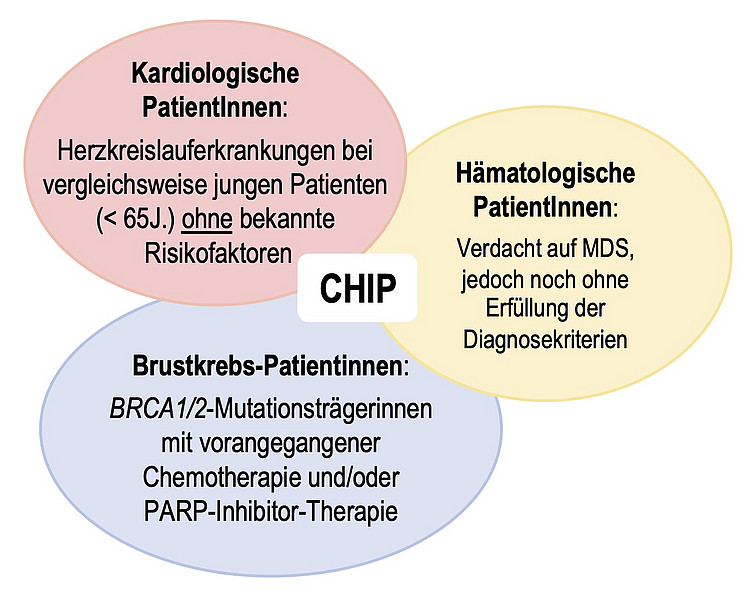 Für CHIP und dessen Auswirkungen auf das hämatopoetische und/oder Herzkreislaufsystem besonders prädisponierte Individuen sind vor allem kardiologische PatientInnen, die bereits in vergleichsweise niedrigem Alter (<65J.) Herzkreislauferkrankungen erleiden, ohne die bekannten Risikofaktoren aufzuweisen. Relativ häufig betroffen sind auch Patientinnen, die eine BRCA1/2-Keimbahnmutation tragen und sich einer Chemo- oder Strahlentherapie und/oder einer Behandlung mit PARP-Inhibitoren unterzogen haben. Bei der CHIP-Entstehung spielt hier wahrscheinlich eine Überforderung der DNA-Reparaturmechanismen eine Rolle. In der Hämatologie ist CHIP auch gehäuft bei Menschen nachweisbar, bei denen sich beispielsweise wegen einer unklaren Anämie der Verdacht auf ein myelodysplastisches Syndrom (MDS) ergibt, die Diagnosekriterien jedoch noch nicht erfüllt sind.