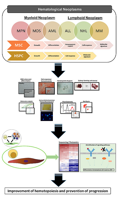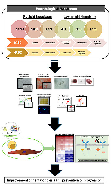 Our research group focuses on the analysis of the bone marrow microenvironment, in particular the interaction of hematopoietic stem and progenitor cells (HSPC) and neighboring cells such as mesenchymal stromal cells (MSC) in patients with hematological neoplasms. Insufficient hematopoiesis is the main feature of these diseases, although the underlying mechanisms by which the malignant cells functionally inhibit healthy hematopoiesis have not been clarified in detail. However, given the central role of the bone marrow microenvironment and in particular MSC in the regulation of normal hematopoiesis, recent work from our group and others suggests that MSC play an important role in this process.