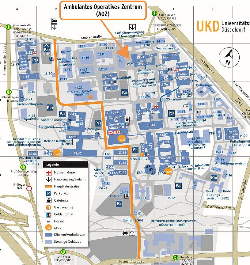 Das AOZ finden Sie wenige Meter hinter dem Haupteingang des UKDs an der Moorenstraße auf der linken Seite (Haus 13.71 im Erdgeschoss). Telefonisch erreichen Sie das AOZ unter 0211- 81 19870.