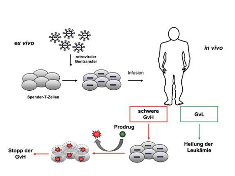 Das wesentliche Problem hier ist: Je mehr T-Zellen verabreicht werden können, desto höher ist die Wahrscheinlichkeit, dass das Rezidiv erfolgreich behandelt werden kann. Gibt man zu wenige Zellen, stirbt der Patient am Rezidiv. Eine viel versprechende Maßnahme zur Kontrolle der GvHD stellt die Ausstattung der Spenderlymphozyten mit einem Suizidgen dar. Die Suizidgenprodukte überführen eine nicht-toxische Substanz (Prodrug) spezifisch in den Suizidgen-positiven Zellen in einen zytotoxischen Metabolit. Im Falle einer lebensgefährlichen GvHD lassen sich so die Suizidgen-tragenden Spenderlymphozyten selektiv durch die Applikation des Prodrugs eliminieren und die GvHD wird gestoppt.