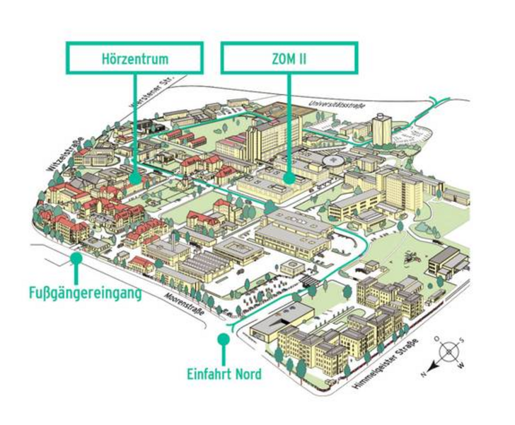 Als Fußgänger gelangen Sie am besten über den Haupteingang der Moorenstraße 5 auf das Gelände des UKDs. Unsere Klinik für Hals-, Nasen- und Ohrenheilkunde befindet sich im Zentrum für Operative Medizin II (ZOM II). Dies ist der Neubau zentral auf dem UKD Campus.