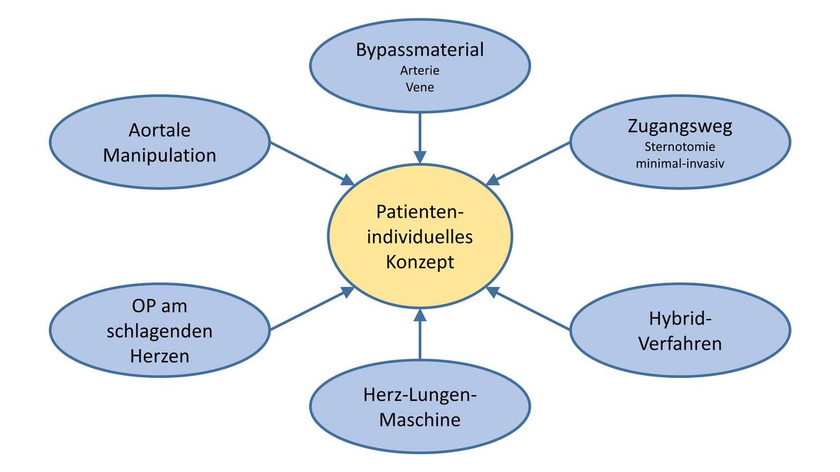 Neben klassischen Operationselementen kommen vor allem zur Minimierung des Operationstraumas und zur Optimierung der Bypassversorgung auch innovative Konzepte zum Einsatz. Hierbei beziehen sich Weiterentwicklungen zur klassischen Bypassoperation insbesondere auf die Graftauswahl, die Zugangswege und die Verwendung der Herz-Lungen-Maschine. Diese modernen Strategien werden in unserer Klinik konsequent eingesetzt und im Folgenden kurz erläutert.