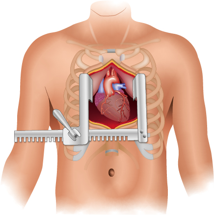 Der klassische Zugangsweg für eine koronare Bypassoperation ist die mediane Sternotomie mit vollständiger Durchtrennung des Brustbeins. Sie erlaubt die sichere Anlage von Bypässen an allen Seiten des Herzens.