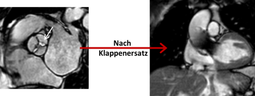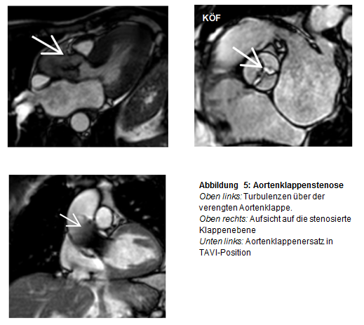 Mit Hilfe von planimetrischen Verfahren (Bestimmung der Klappenöffnungsfläche) sowie Phasen-Kontrast-Sequenzen kann sowohl die morphologische als auch funktionelle Quantifizierung von Herzklappenerkrankungen (z.B. Aortenklappen-Erkrankungen) erfolgen. Nach erfolgter minimalinvasiver Klappenimplantation kann die Funktion der Herzklappe sowie die Struktur des Myokards verlaufsbeurteilt werden.
