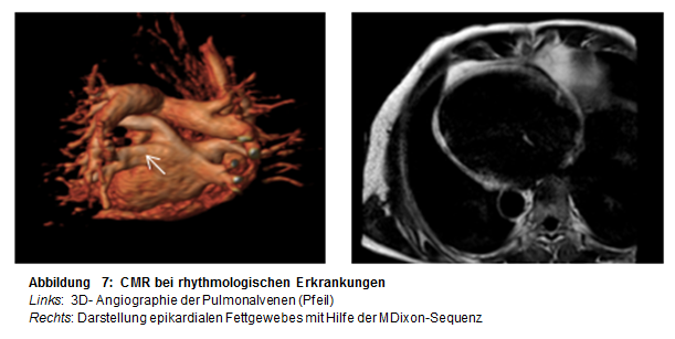 Zur Verlaufskontrolle nach Pulmonalvenenisolation (PVI) als Therapie des Vorhofflimmerns werden die Einmündungen der Pulmonalvenen in den linken Vorhof mittels 3D-Angiographie beobachtet. Bei ventrikulären Herzrhythmusstörungen können strukturelle Ursachen mittels Narbendetektion erkannt werden. Darstellung von Vorhoffett und der Größe, Funktion des Vorhofes dienen zur Beurteilung der Wahrscheinlichkeit von Vorhofflimmer Rezidiven.
