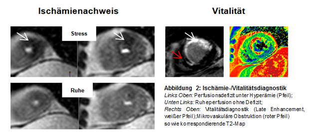 Eine der Haupt-Indikationen für die CMR ist die Ischämiediagnostik mittels Kontrastmittel-gestützter Perfusions- oder Kontraktionsuntersuchung. Bei Patienten mit mittlerer Vortest-Wahrscheinlichkeit kann hiermit mit hoher Sensitivität und Spezifität die hämodynamische Relevanz einer Koronarstenose erkannt werden. Somit ist eine Herzkatheteruntersuchung sinnvoll, wenn eine Durchblutungsstörung ohne myokardiale Narben vorliegt.