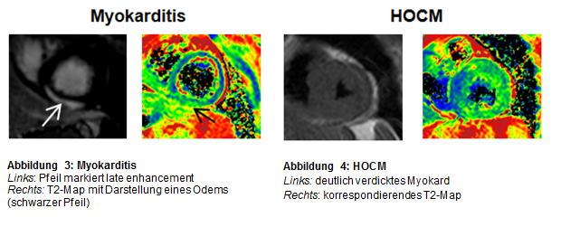 Zur Abklärung einer Herzmuskelentzündung werden verschiedene CMR-Sequenzen angewandt, um Inflammation im Herzmuskel darzustellen. Ferner kann mit CMR die Differenzierung zwischen den verschiedenen Kardiomyopathien oder Herztumoren erfolgen. Durch Verwendung neuer Mapping-Verfahren kann hoch-sensitiv eine Schädigung des Myokards oder eine Vergrößerung des Extrazellulärraumes erkannt werden.