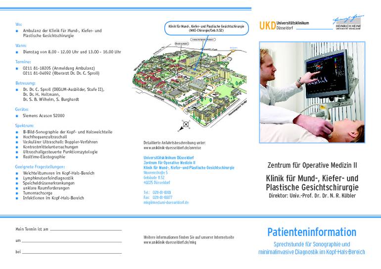 Eine vollständige Ultraschalluntersuchung und Dokumentation im Kopf- und Halsbereich kann bis zu 30 Minuten dauern. Für krankhafte Veränderungen gibt es momentan kein besseres diagnostisches Verfahren als die Sonographie. Dies gilt umso mehr, je näher der Befund bzw. die Veränderung an der Körperoberfläche gelegen ist. In der Hand des geübten Diagnostikers übertreffen die Ergebnisse der Sonographie die der Computertomographie.