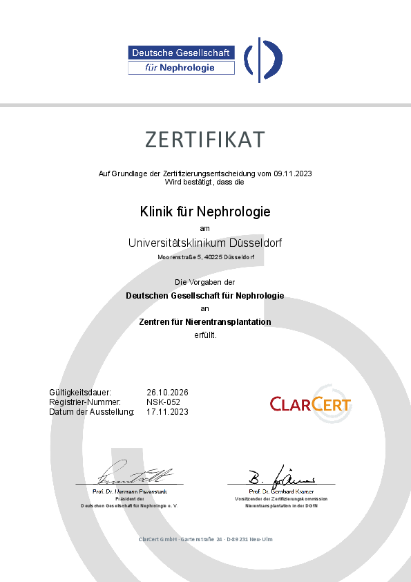 Ein zentrales Aufgabenfeld der Klinik für Nephrologie ist die Transplantation von Nieren. Die Ärzte des Nierentransplantationszentrums unter Leitung von Professor Rump verwenden Spenderorgane von Verstorbenen und verwandten sowie nicht verwandten Lebendspendern. Die 2018 frisch renovierte Transplantationsstation im MNR-Gebäude verfügt über eine ausgezeichnete Ausstattung, die die Betreuung der frisch transplantierten Patienten erleichtert. Wegen der langjährigen Erfahrung spezialisierter Ärzte der beteiligten Kliniken für Nephrologie, Gefäßchirurgie und Urologie ist das Nierentransplantationsprogramm Düsseldorf seit vielen Jahren eines der größten in Deutschland. Die Nachsorge von nierentransplantierten Patienten liegt uns besonders am Herzen.