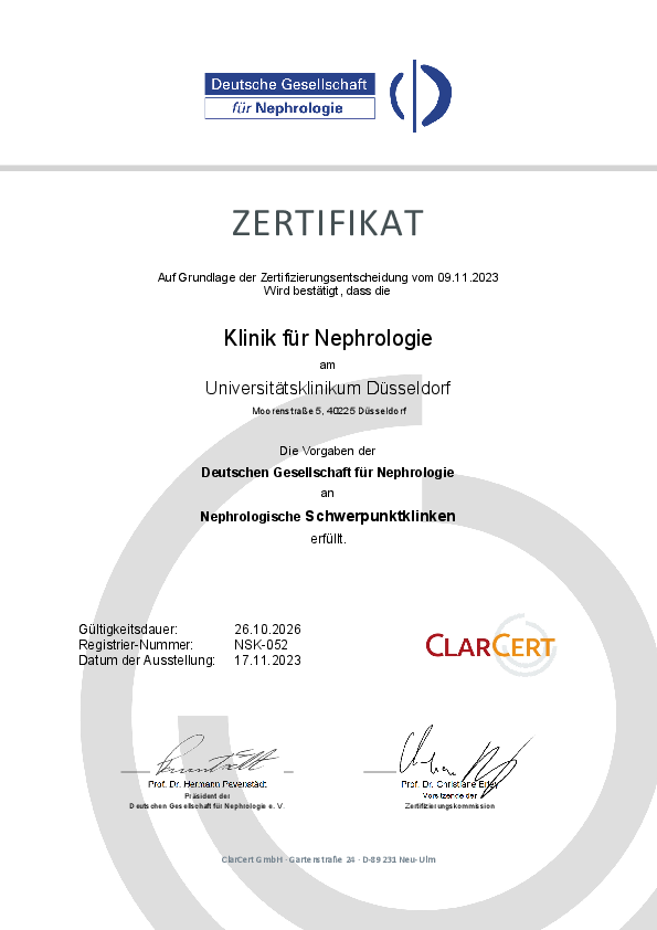 In der Klinik für Nephrologie werden alle akuten und chronischen Nierenerkrankungen und alle Systemerkrankungen mit Nierenbeteiligung behandelt. Die Planung und Vorbereitung auf eine Nierentransplantation und deren Nachsorge nach erfolgreicher Nierentransplantation sind ein Schwerpunkt der Klinik. Die Klinik für Nephrologie ist ein Europäisches Exzellenzzentrum für Hypertonie und verfügt über besondere Erfahrung in der Diagnostik und Therapie der primären, sekundären und schwer einstellbaren arteriellen Hypertonie.