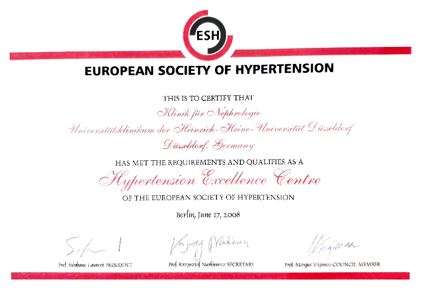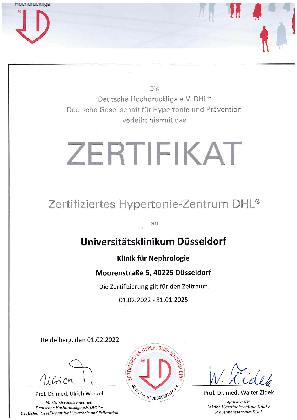 Die arterielle Hypertonie (Bluthochdruck) wird oft durch Erkrankungen der Niere ausgelöst oder schädigt Niere und Blutgefäße. In diesem Bereich sind aktuelle Diagnostik, Differentialdiagnostik und differenzierte Therapie wesentliche Arbeitsfelder der hiesigen Nephrologie. Die Abklärung und Therapie des primären Hyperaldosteronismus oder des Phäochromozytom, einer Schlafapnoe oder renovaskulärer Erkrankungen sind hier zu nennen. Außerdem existiert eine enge Zusammenarbeit mit der Frauenklinik, welche eine erfolgreiche Therapie für schwangere Patientinnen mit systemischen immunologischen Erkrankungen und unterschiedlichen Formen der Hypertonie einschließlich Präeklampsie und Eklampsie (schwangerschaftsbedingter Bluthochdruck) und HELLP-Syndrom (seltene, gefährliche Komplikation des schwangerschaftsinduzierten Hochdrucks) gewährleistet.