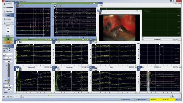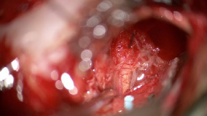 OBEN: MRT mit Akustikusneurinom, Mitte: Sicht durch das OP-Mikroskop, Unten: Billdschirm des Neuromonitoring