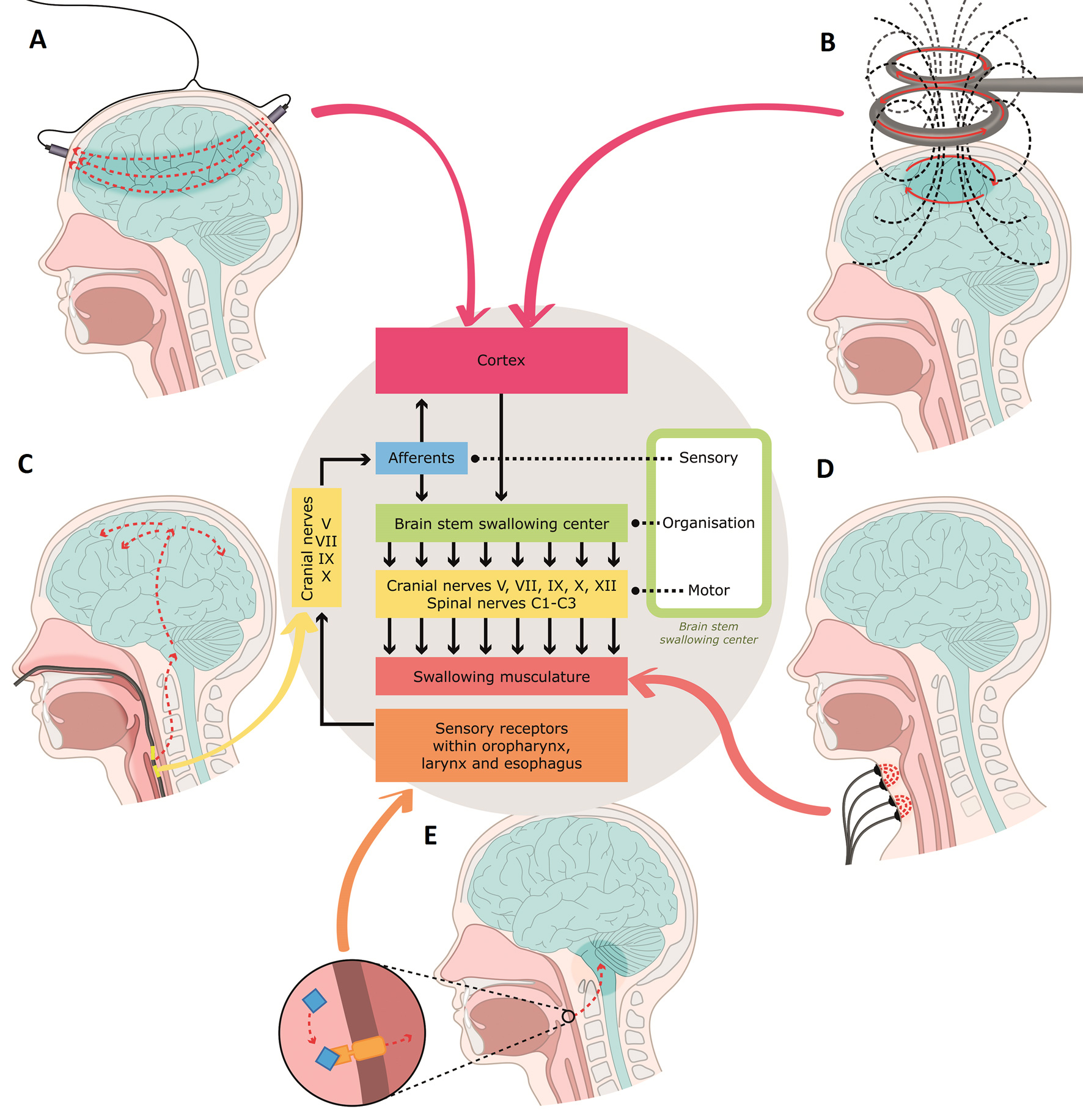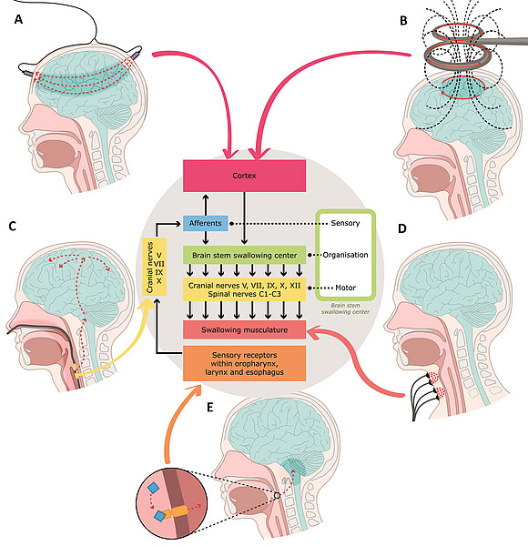 C: Pharyngeale Elektrostimulation als sensorischer Stimulus. Die Stimulation der Schluckmuskulatur im Pharynx durch elektrische Impulse kann sensorische Signale senden, die das Schlucknetzwerk modulieren und die Schluckfunktion postitiv beeinflussen.
