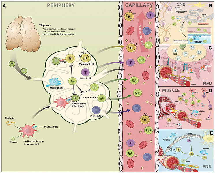 Ziel unserer Arbeitsgruppe ist es Gemeinsamkeiten und Unterschiede in den pathophysiologischen Mechanismen von Erkrankungen des ZNS und PNS zu identifizieren, Erkenntnisse zu übertragen und diese auf ihre potentielle Bedeutung für neue Therapiekonzepte hin zu überprüfen (system- und krankheitsübergreifende Translation). Hierzu besteht unser Forschungsansatz aus einer Kombination von Tiermodellen und gut definierten klinischen Kohorten mit entsprechenden multidimensionalen Begleitanalysen auf molekularer, zellulärer und systemischer Ebene (z.B. FACS, Histologie, Transcriptomics und Proteomics). Neben der Übertragung von Erkenntnissen aus Modellsystemen auf die humanen Verhältnisse (Vorwärtstranslation) werden im humanen System identifizierte Pathomechanismen in Tiermodellen simuliert (Rückwärtstranslation) und durch die Kombinationen beider Ansätze die Entwicklung neuer diagnostischer, prognostischer und therapeutischer Marker vorangetrieben (bidirektionale Translation). Basierend auf diesen Konzepten wollen wir systemübergreifende und gewebespezifische Pathomechanismen neurologischer Erkrankungen verstehen und untersuchen hier sowohl Prinzipien der Immunsystemaktivierung- und regulation (z. B. T-Zell Effektorfunktionen, regulatorische T Zellen), der Transmigration an Barrieresystemen (z. B. Blut-Hirn-Schranke) sowie der direkten Interaktion von Immunzellen und Strukturen des ZNS und PNS (z. B. immunologische Muskelzellfunktionen).