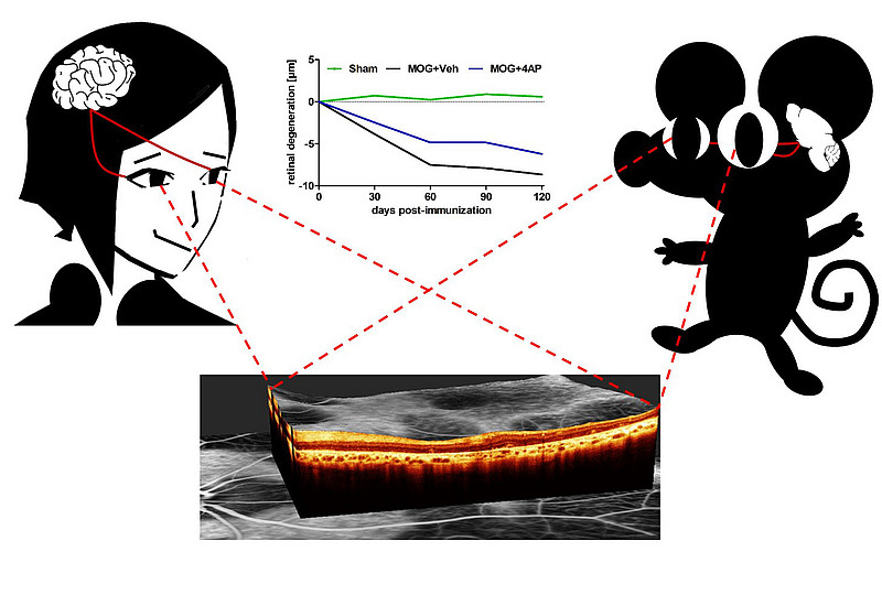 Abbildung: Die Neurodegeneration im zentralen Nervensystem lässt sich mittels Optischer Kohärenztomographie (OCT) in der Netzhaut des Auges messen, sowohl bei Patient*innen als auch in Maus-Krankheitsmodellen. So lässt sich z.B. die Wirksamkeit von neuroprotektiven Substanzen (hier 4AP) in der MOG-induzierten Optikusneuritis untersuchen.