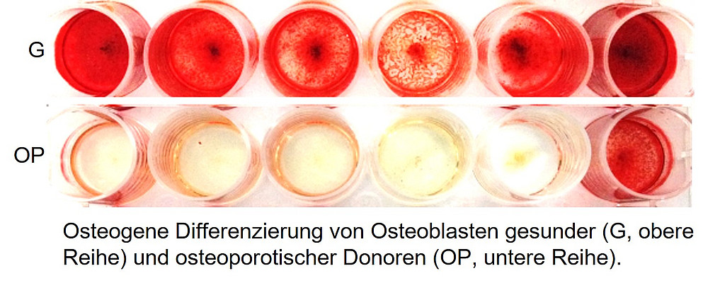 In diesem Themenbereich interessiert uns neben den Einflüssen eines erhöhten altersbedingten oxidativen Stresses auch der Einfluss eines erhöhten altersbedingten Entzündungsstatus auf das osteogene Differenzierungspotential humaner Stammzellen und Osteoblasten, gewonnen aus jungen sowie älteren Donoren. Das Krankheitsbild der Osteoporose ist vermeintlich das Resultat eines erhöhten oxidativen Stresses sowie einer chronisch systemischer Entzündung (“Inflammaging“). Neuere Befunde deuten zudem darauf hin, dass in der Pathogenese der Osteoporose der Muskelzellmetabolismus ebenfalls eine wichtige modulierende Rolle spielen könnte. Zu klären, ob diese Annahme stimmt und sich im Rahmen eines in vitro in Zellkultur mit primären Osteoblasten modellieren und bestätigen lässt, ist das Ziel unterschiedlicher Projekte dieses Themenbereichs.