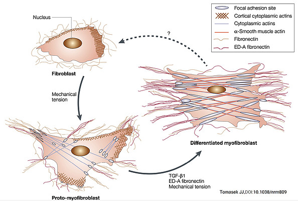 Das individuelle Risiko der Entwicklung von Narbe oder Keloiden als Folge einer fehlgeregelten Wundheilung nach operativen Eingriffen oder Verbrennungen ist oft unvorhersehbar und kann nicht nur zu ästhetischen, sondern bei Entwicklung entsprechender Narbenkontrakturen auch ernsthaften gesundheitlichen Problemen führen. Wir untersuchen seit Jahren die Möglichkeit, die zumeist TGF-beta-abhängigen Signalwege der Myofibrogenese zu modulieren, modifizieren und letztendlich zu inhibieren, um den erwähnten sklerotischen Ereignissen der Narbenbildung entgegen wirken zu können. Unsere bisherigen Ergebnise weisen auf eine besondere Rolle der mitochondrialen Atmungskette als Schlüsselbereich in der Regulation der Myofibrogenese hin. Diese Annahme wollen wir im Rahmen mehrerer experimenteller Promotionsarbeiten in den nächsten Jahren evaluieren.