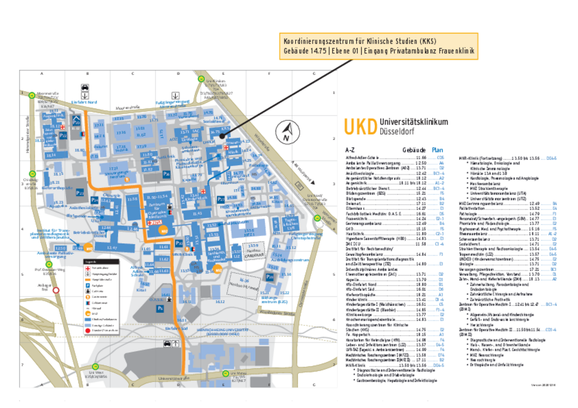 Vom Haupteingang des UKD an der Moorenstraße gehen Sie geradeaus, bis Sie an die zentrale Grünfläche kommen. Dort biegen Sie nach links ab und folgen der Straße bis zum Ende. Das Gebäude vor Kopf ist die (neue) Frauenklinik Geb. 14.22. Benutzen Sie dort den Haupteingang und nehmen Sie den Gang links, um in das alte Gebäude 14.75 hinüber zu wechseln. Dort befindet sich rechterhand ein Aufzug und linkerhand ein Treppenhaus. Das KKS befindet sich im 1. Stock.