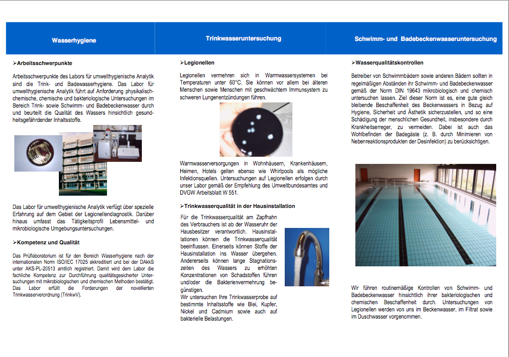Die Akkreditierung umfasst mikrobiologische, physikalisch-chemische und chemische Untersuchungen von Wasser inkl. Trink- und Badewasser einschließlich der Probenahme.