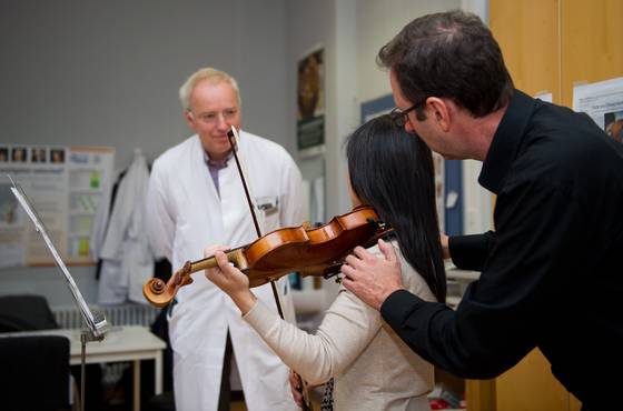 Die Interdisziplinäre Ambulanz für Musikermedizin im Universitätsklinikum Düsseldorf (UKD) legt Wert auf die zügige Abwicklung aller notwendigen diagnostischen Untersuchungen ihrer Patienten. So werden betroffene Musiker, die an komplexen Beschwerden leiden, oft an einem einzigen Tag geplant mit mehreren Ambulanzen vernetzt, meist mit der neurologischen, handchirurgischen, orthopädischen oder der HNO-Ambulanz. Durch diese überaus enge Zusammenarbeit der Experten kommt es dann schon früh zur Stellung der korrekten Diagnose und zur Einleitung eines Therapieplans. Vor allem Patienten, die von weiter weg kommen, profitieren von dieser Vernetzung der Fachkliniken am UKD.