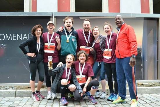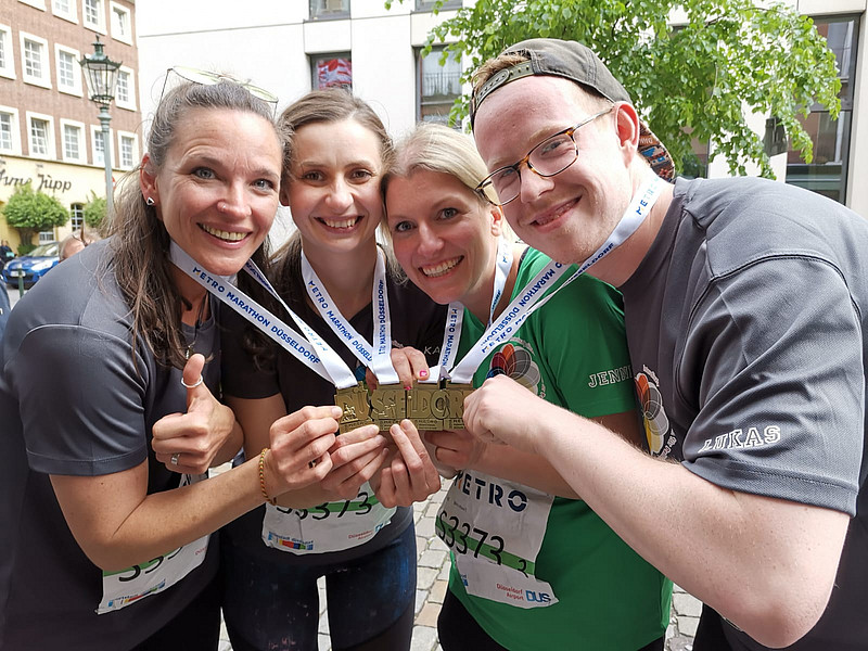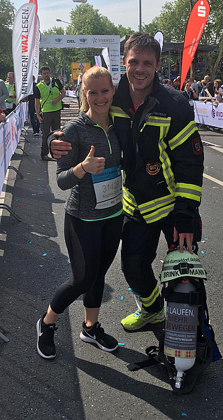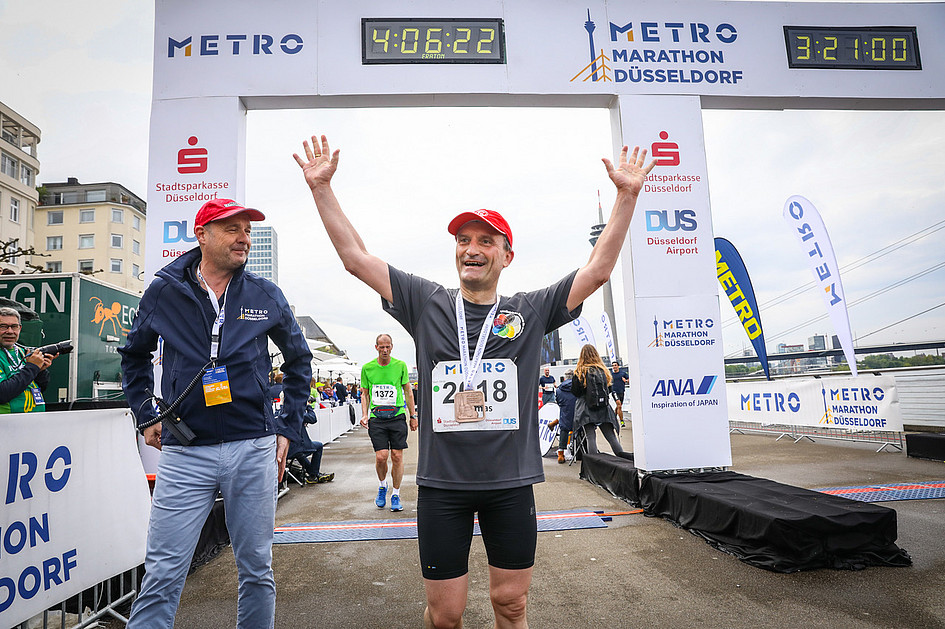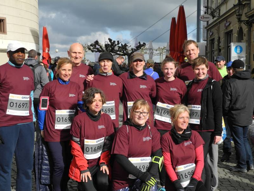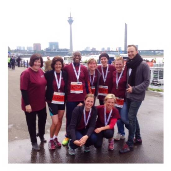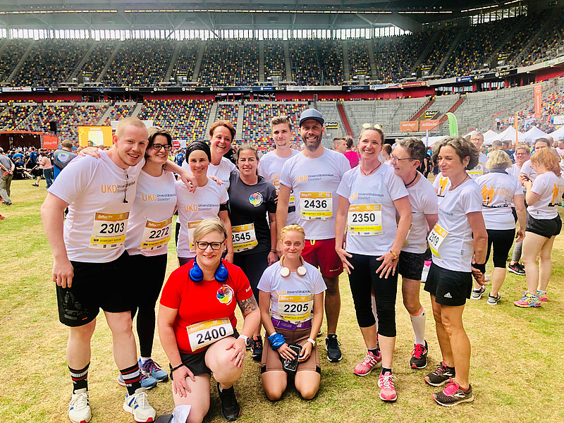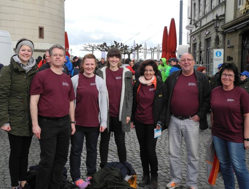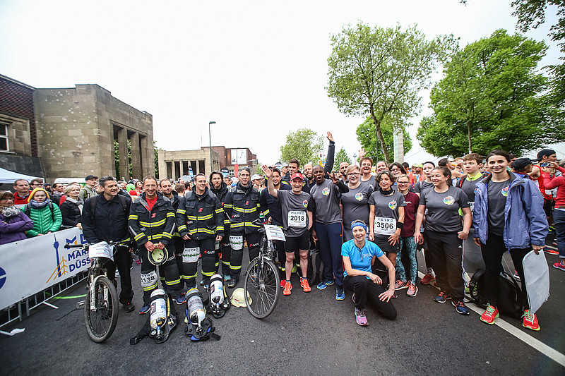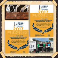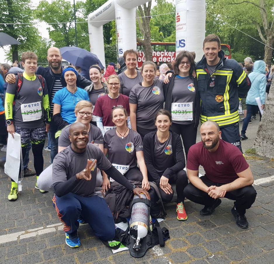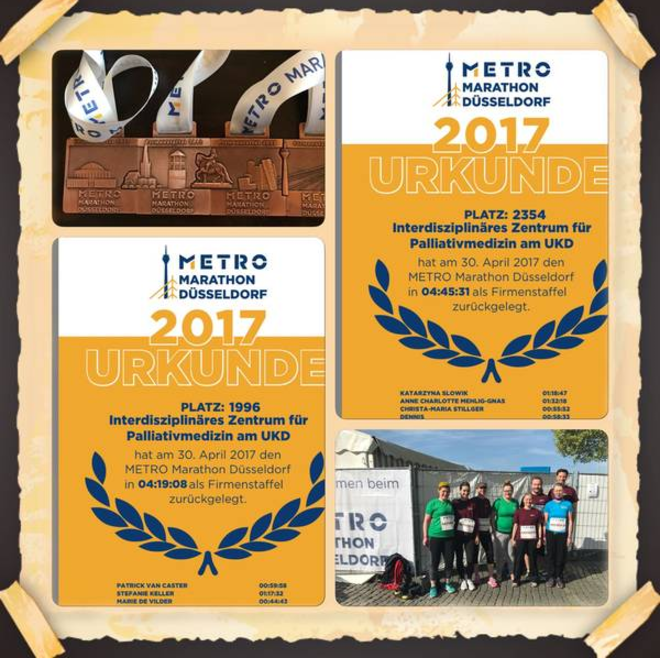 Beim 16. Metro Marathon, der am 29. April 2018 in Düsseldorf stattfand, waren auch wieder zahlreiche Läufer des Interdisziplinären Zentrums für Palliativmedizin am Start - allen voran der Schirmherr des Fördervereins Thomas Geisel, der die komplette Marathonstrecke im Trikot des Zentrums für Palliativmedizin lief. Neben drei eigenen Staffeln des Zentrums startete Birgit Hendrichs auf der gesamten Distanz und erreichte in Ihrer Altersklasse einen Spitzenplatz. Außerdem lief Christian Ruda, Berufsfeuerwehrmann der Stadt Düsseldorf, die gesamten 42,195 Kilometer in kompletter Schutzausrüstung inklusive Atemschutzgerät und Helm. Seine Kollegen Malte Ammernick, Patrick Rauscher, Tobias Barzen und Thomas Barzen teilten sich die Strecke als Staffel, Jonas Brinkmann unterstützte eine der Staffeln des Zentrums - ebenfalls in kompletter 25 Kilo schwerer Montur. Außerdem hatten die Feuerwehrleute Helm und Atemschutzgeräte mit dem Logo des Zentrums versehen. Alle laufen zusammen für das Zentrum für Palliativmedizin der Uniklinik Düsseldorf und erreichen mit der Unterstützung von großzügigen Sponsoren eine Spendensumme von 1.860 Euro.