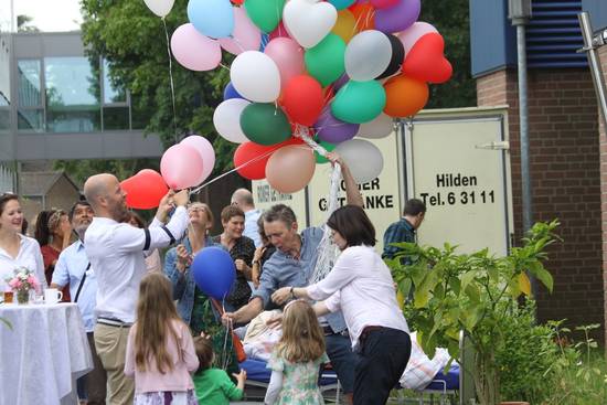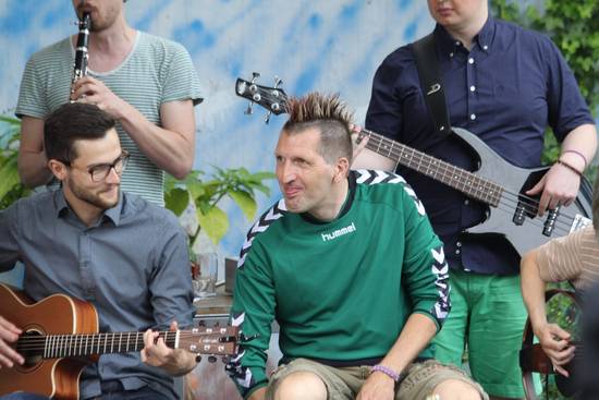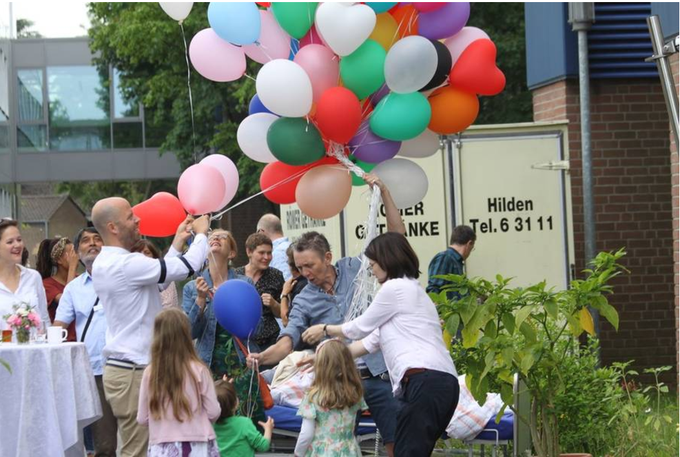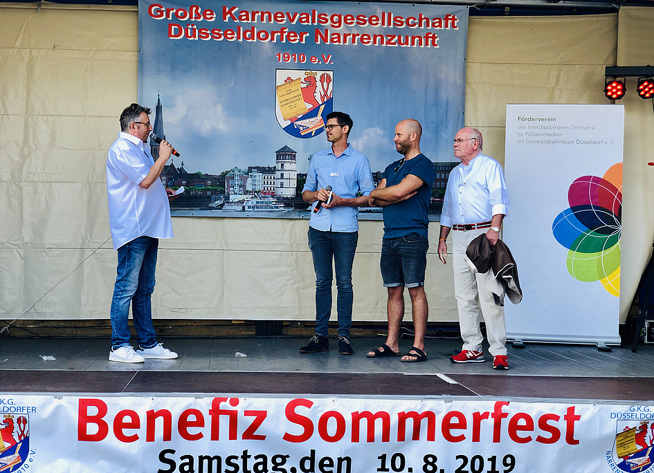 Das Interdisziplinäre Zentrum für Palliativmedizin feierte am 11. Juni 2016 mit einem Sommerfest und einem Tag der offenen Tür seinen 5. Geburtstag. Das Wetter spielte mit und wir verbrachten einen schönen und beschwingten Tag mit Mitarbeitern und Kooperationspartnern, Patienten und zahlreichen Gästen im Stationsgarten. Würstchen brutzelten auf dem Grill, ein Eiswagen war vorgefahren, bunte Ballons wehten im Wind, fröhliche Stimmung und Live Musik. Musikalisch unterhielten zunächst Stephan Liebsch und Leeze Muchai Bock von "You shall rise" die Gäste. Danach begeisterte die Band der Düsseldorfer Kinderonkologie, die "Fighting Spirits". Die Band besteht aus ca. 20 Musikern, die entweder als Erkrankte, als Familienmitglieder oder als ehrenamtliche Wegbegleiter mit Krebs konfrontiert sind oder waren.