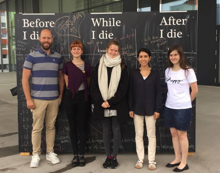 Am Samstag, den 25. Juni 2016, wurde vor dem Studierenden Center der Heinrich-Heine-Universität (HHU) im Rahmen eines Kooperationsprojektes von der Hochschulgruppe "JASMIN - Kreis der Frauen HHU" und dem Interdisziplinären Zentrum für Palliativmedizin angelehnt an ein amerikanisches Vorbild eine "BeforeWhileAfter I Die Wall" aufgestellt. Die vier Seiten des Würfels sind in vier Sprachen auf deutsch, englisch, französisch und japanisch mit den Aussagen „Bevor ich sterbe möchte ich...“, „Während ich sterbe möchte ich...“ und „Nachdem ich sterbe möchte ich...“ versehen und können mit bereitgestellter Kreide von Passanten vervollständigt werden. Der Ursprung der „Before I Die Wall“ stammt aus Amerika, wo die Künstlerin Candy Chang sich nach einem Trauerfall die Frage stellte, was man im Leben oder vor seinem Tod noch machen möchte. Sie entwarf im Jahr 2011 eine Wand, auf der die Menschen ihre Antworten notierten und erzeugte damit eine Aktion, die schon über 400 Mal in 60 Ländern und 25 Sprachen aufgegriffen und umgesetzt wurde. Gül Nur Bozkurt, Leiterin und Gründerin der Hochschulgruppe und Leiterin des Projekts, möchte mit der Wand die Menschen motivieren, sich mit ihrem Leben, ihren Plänen und Wünschen auseinanderzusetzen.