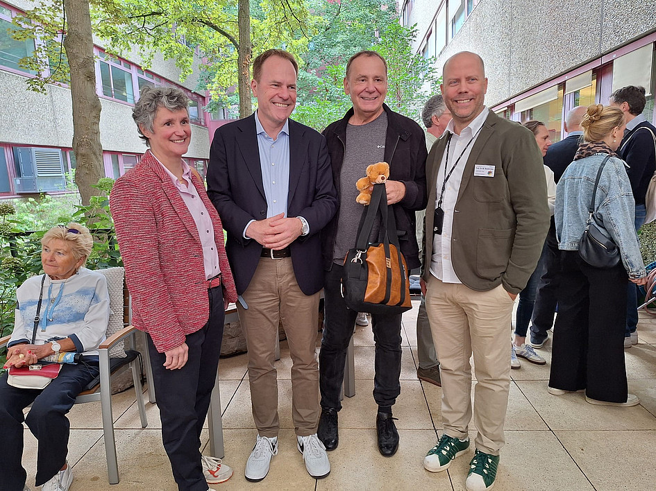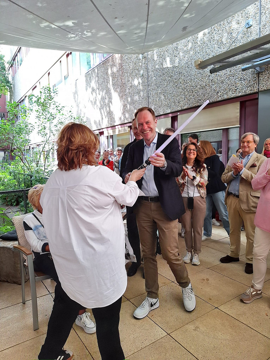 Zu den Ehrengästen zählten der Oberbürgermeister der Landeshauptstadt Düsseldorf und Schirmherr des Fördervereins, Dr. Stephan Keller, sowie der bekannte Karnevalswagenbauer Jacques Tilly. Anita Kramer übereichte dem Oberbürgermeister als Dankeschön für sein Engagement bei der Schaffung einer städtischen Koordinationsstelle zur Hospiz- und Palliativversorgung ein Leuchtschwert, mit dem er bezüglich der Finanzierung dieser Stelle einen gordischen Knoten durchschlagen habe. In seinem Grußwort betonte der Oberbürgermeister die gesellschaftliche Bedeutung einer menschenwürdigen Begleitung in der letzten Lebensphase und würdigten das Engagement des multiprofessionellen Teams sowie der vielen ehrenamtlich Mitwirkenden. Jacques Tilly übernahm „Pallipaulchen“, das schon letztes Jahr in der Landespolitik unterwegs gewesene Maskottchen des Zentrums, welches damit dieses Jahr vermutlich in der Künstler:innenszene auf Reisen gehen wird.