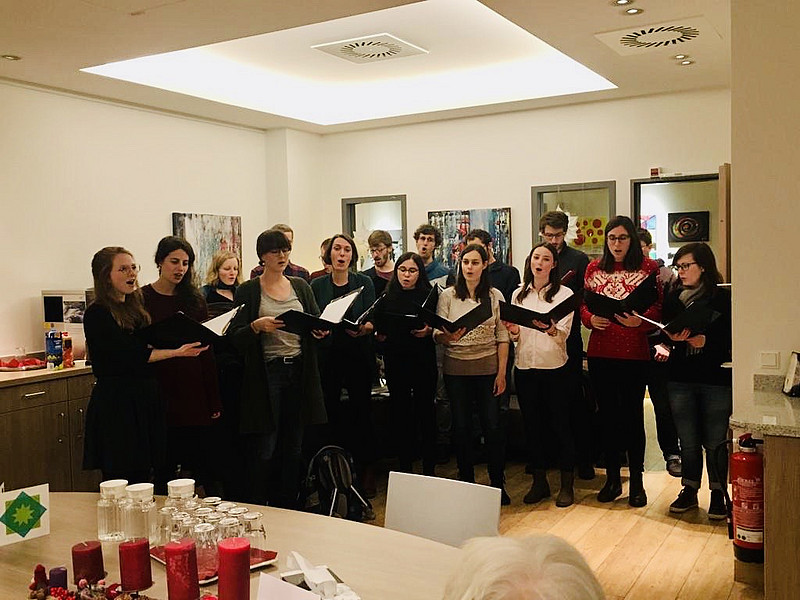 Am 2. Advent kam in guter Tradition der Junge Kammerchor Düsseldorf zu einem Konzert auf die Palliativstation unseres Zentrums. Über 50 Sängerinnen und Sänger erfreuten sowohl die Patienten, als auch deren Zugehörige, sowie die Mitarbeiter auf beeindruckende Art und Weise mit wunderschönen adventlichen Chorklängen. Einige Patienten lauschten der Musik im Wohnzimmer der Station, auf Wunsch kamen die Sänger auch zu jedem einzelnen Patienten ins Zimmer. Hierdurch entstanden schöne und emotionale Momente mitten im Leben.