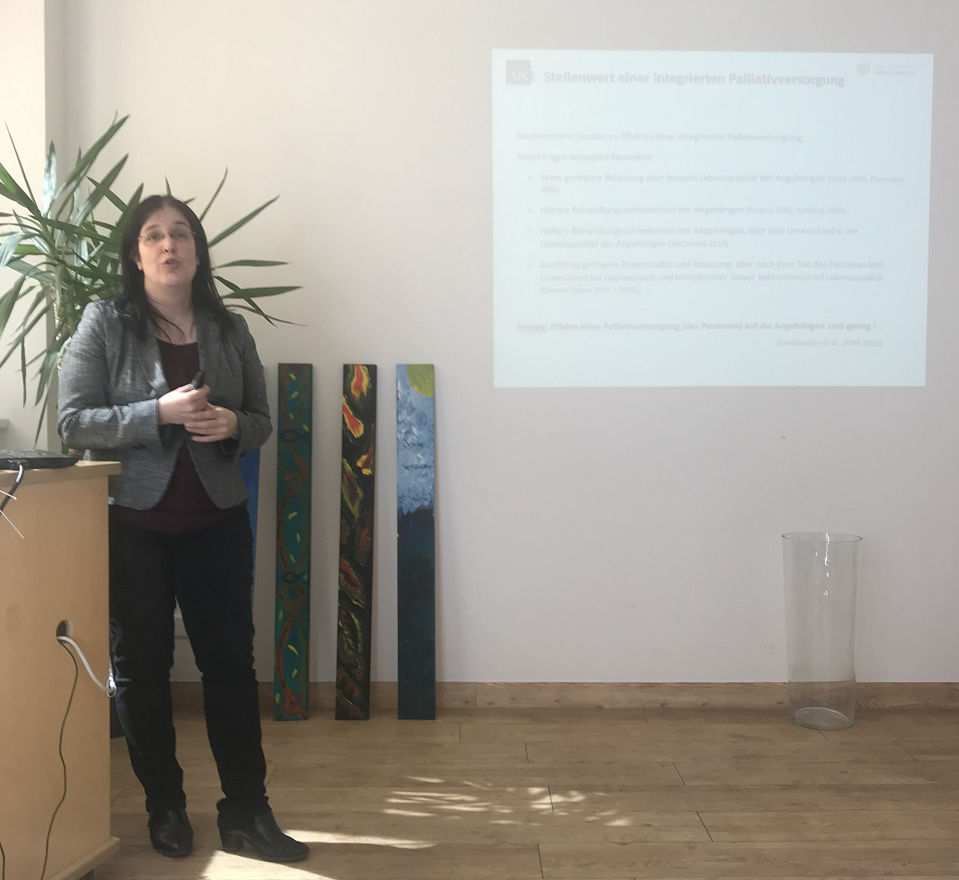 Sie fokussierte in Ihrem Vortrag auf die dynamische Entwicklung der Palliativmedizin hin zu einer Versorgung der Patienten ab Diagnosestellung. Hierbei legte sie besonderen Wert auf die Darstellung der "Early Integration", also der frühzeitigen Einbindung und Mitbehandlung bei onkologischen Patienten, deren Symptomlast und die notwendige Behandlung auf den vier Ebenen (physisch, psychisch, sozial und spirituell) auch im Rahmen des Total-Pain Konzeptes.