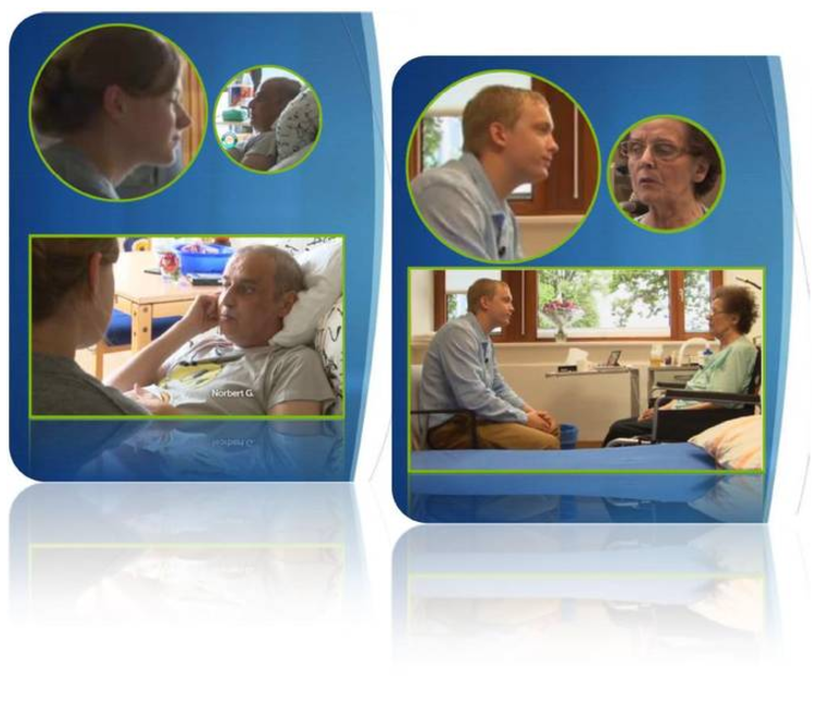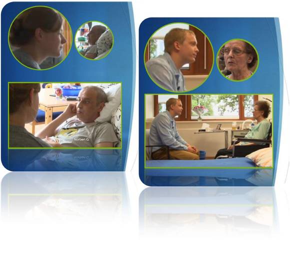 Filmsequenzen aus dem Spielfilm „Ich sehe Dich“, den Interviews aus dem BMBF-Projekt „30 Junge Menschen sprechen mit sterbenden Menschen und deren Angehörigen“ und evtl. Patientengespräche mit Real- oder Schauspielpatienten sollen die Basis für die medialen Elemente bilden, die in die eLearning-Module integriert werden.