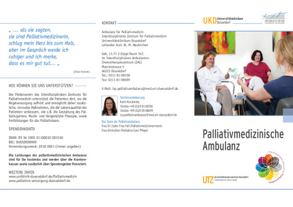Wir bieten jeden Donnerstag von 13:00 - 16:00 Uhr eine ambulante Sprechstunde an. Nach vorheriger Terminvereinbarung beraten und unterstützen wir dort Menschen mit einer unheilbaren Erkrankung und deren An- und Zugehörige. Dadurch ist es möglich, schon frühzeitig Kontakt zur Palliativmedizin aufzunehmen und belastende Symptome zu erkennen und zu behandeln. Hierbei steht die Verbesserung der Lebensqualität im Vordergrund. Außerdem kann im Rahmen der palliativmedizinischen Sprechstunde rechtzeitig über palliativmedizinische Unterstützungsangebote gesprochen werden. Detaillierte Informationen über die Angebote der Ambulanz und die Terminvergabe finden Sie in diesem Flyer.