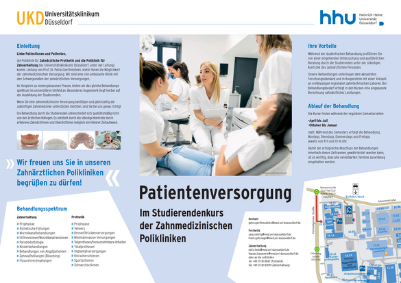 In unserer Poliklinik bieten wir das gesamte Spektrum der zahnärztlichen Prothetik an. Patienten können sich ihren Wünschen entsprechend durch zahnärztliche Mitarbeiter der Abteilung oder im Studentenkurs behandeln lassen. Alternativ können sich Patienten auch für eine Behandlung in der Privatambulanz der Poliklinik für Zahnärztliche Prothetik durch Prof. Dr. Petra Gierthmühlen und ihrem Team entscheiden.