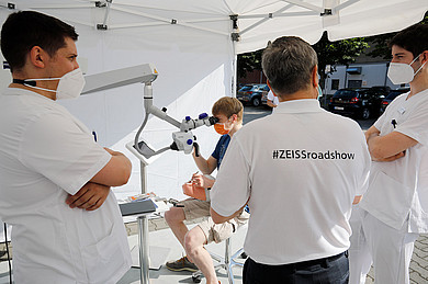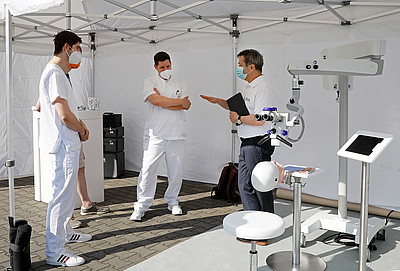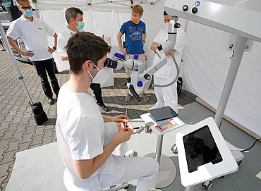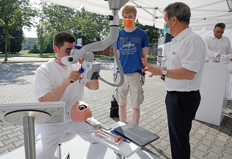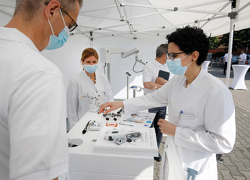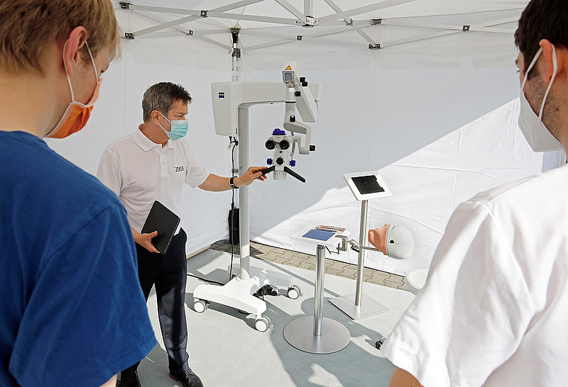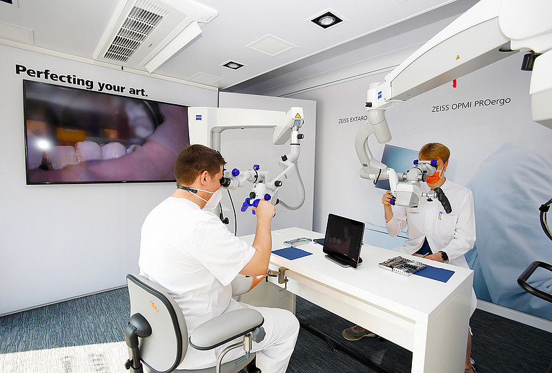 Zusätzlich zur Präsentation von aktuellen Anwendungen und Behandlungslösungen in der Dentalmikroskopie bestand für die Studierenden und Mitarbeiter die Möglichkeit, die Mikroskope und auch Lupenbrillen im „Dental Experience Truck“ zu testen.