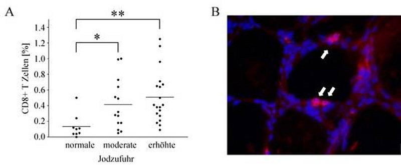 Eine Studie befasste sich mit der Frage, ob eine erhöhte Jodzufuhr den immunologischen Prozess einer Autoimmunthyroiditis (AIT) in genetisch prädisponierten Individuen beeinflusst. Unsere Arbeitsgruppe konnte zeigen, dass eine erhöhte Jodzufuhr zwar leichte immunologische Veränderungen hervorruft (Veränderung der Frequenz einiger Immunzellen sowie der Zytokin-Produktion, siehe Abbildung), aber vermutlich nicht den Krankheitsverlauf im genetisch prädisponierten Individuum verändert.