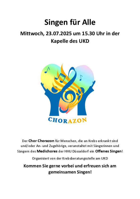 Am 23.07.2025 hat der von der Krebsberatungsstelle organisierte Chor Chorazon mit Unterstützung einiger Sängerinnen und Sängern des Medichores der Heinrich-Heine-Universität ein Offenes Singen in der Kapelle auf dem Klinikgelände veranstaltet. Ungefähr 20 Gäste sind der Einladung gefolgt und hatten Spaß beim Mitsingen. Wir finden, dass die Videos gut zeigen, wieviel Freude gemeinsames Singen macht!