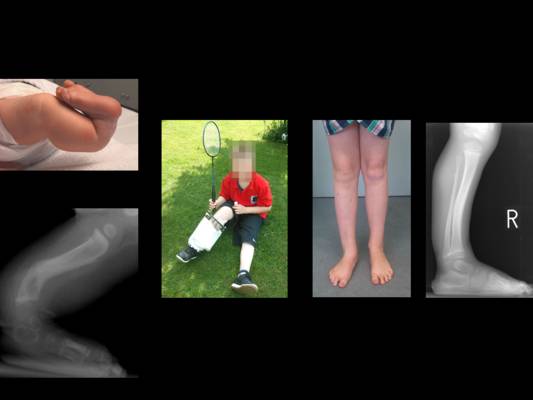 Abb.: Fabian wurde mit einer ausgeprägten Deformität des rechten Unterschenkels geboren: der Knochen war verbogen und zu kurz. Im Alter von 8 Jahren wurde der Knochen mit einem Fixateur externe verlängert und seine Achse aufwändig korrigiert. Nun hat er zwei gleich lange Beine, ist schmerzfrei und macht alles, was Kinder in diesem Alter machen ... Fußball, Handball etc.