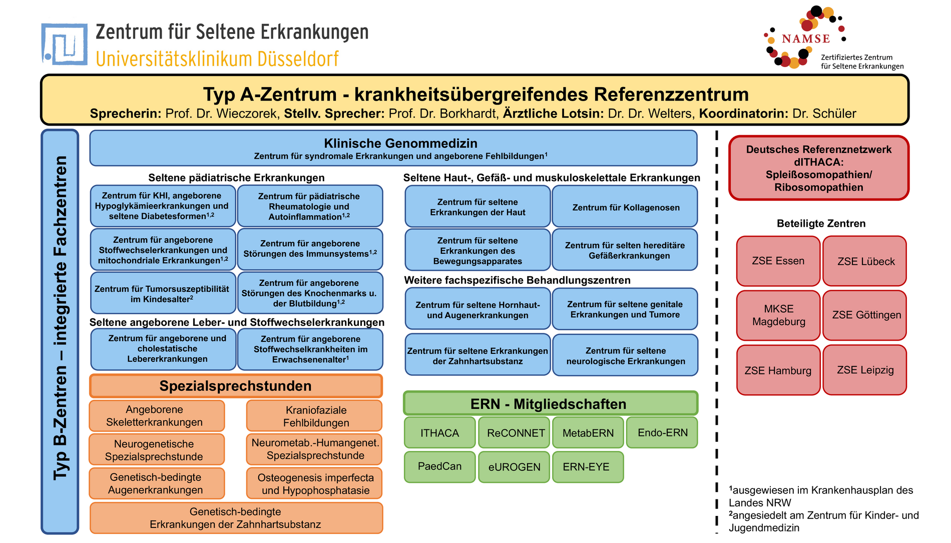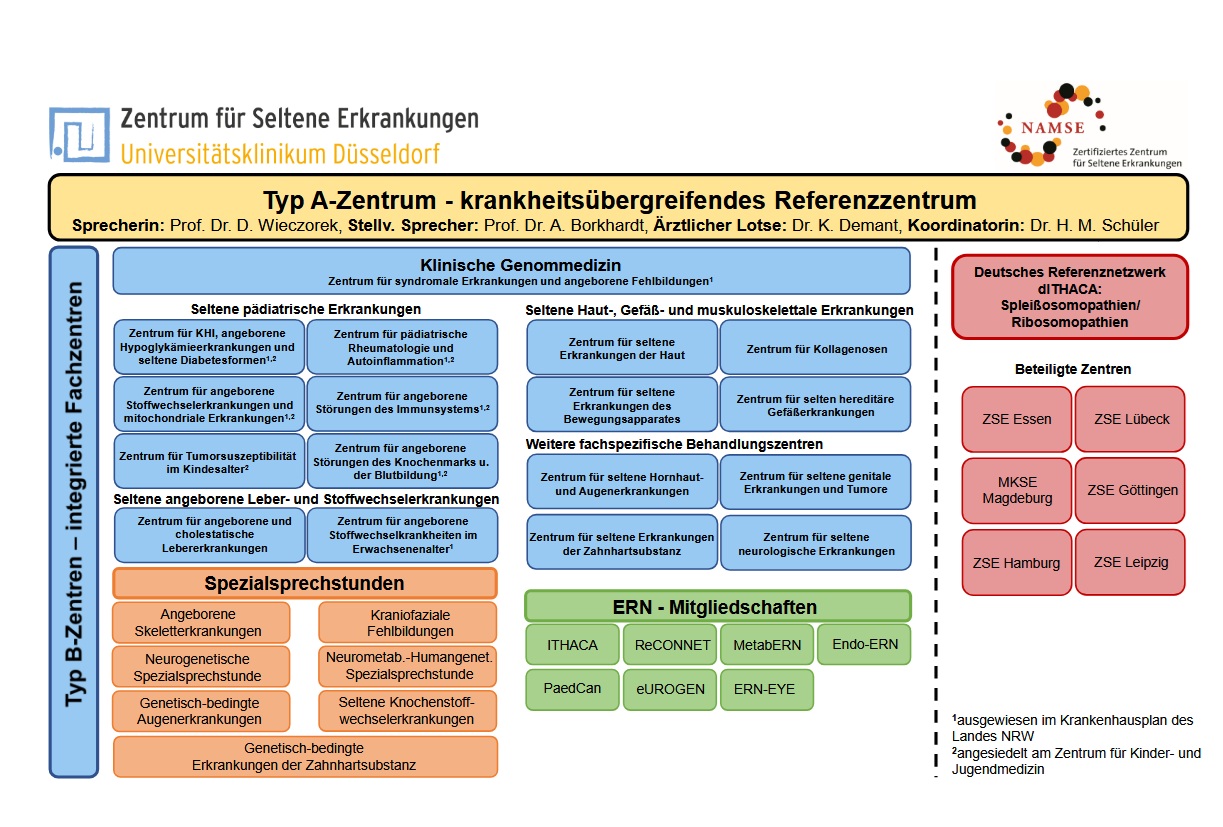 Das Zentrum für seltene Erkrankungen am Universitätsklinikum Düsseldorf (ZSED) setzt sich aus dem krankheitsübergreifenden Referenzzentrum (Typ A-Zentrum) und 16 integrierten Fachzentren (Typ B-Zentren) zusammen. Neben den Spezialambulanzen der Fachzentren werden am ZSED aktuell sieben interdisziplinäre Spezialsprechstunden für ambulante und/oder stationäre Patienten geführt, an denen sich Vertreter der integrierten krankheitsspezifischen Typ B-Zentren beteiligen. Es bestehen außerdem zahlreiche regionale (Netzwerk NRW-ZSE), nationale (AG-ZSE) und internationale Vernetzungen - so sind die Fachzentren des ZSED beispielsweise in mehreren europäischen Referenznetzwerken vertreten, die bei Bedarf den Austausch mit weiteren Fachexperten ermöglichen.