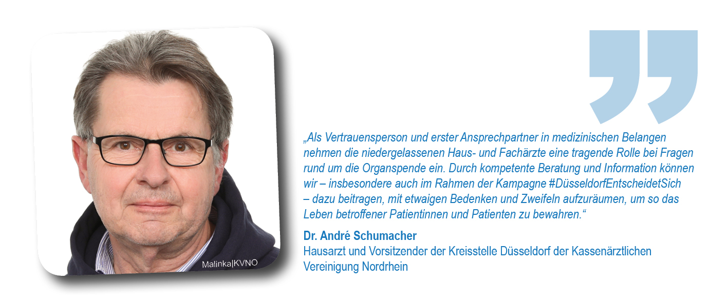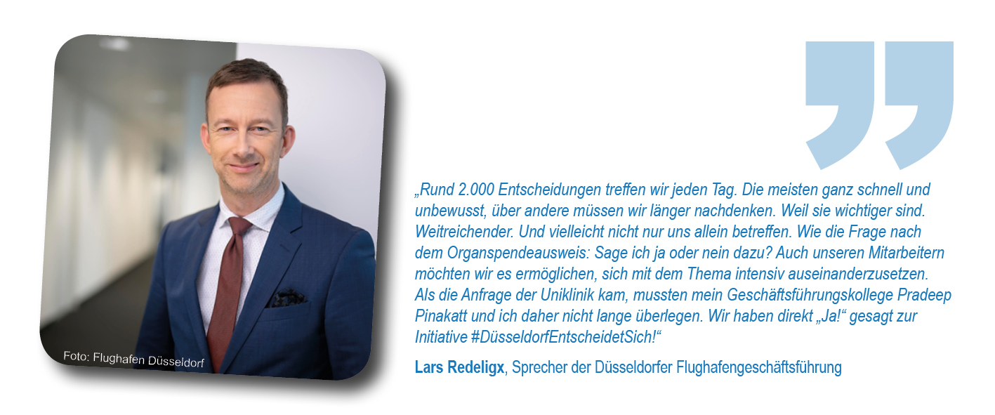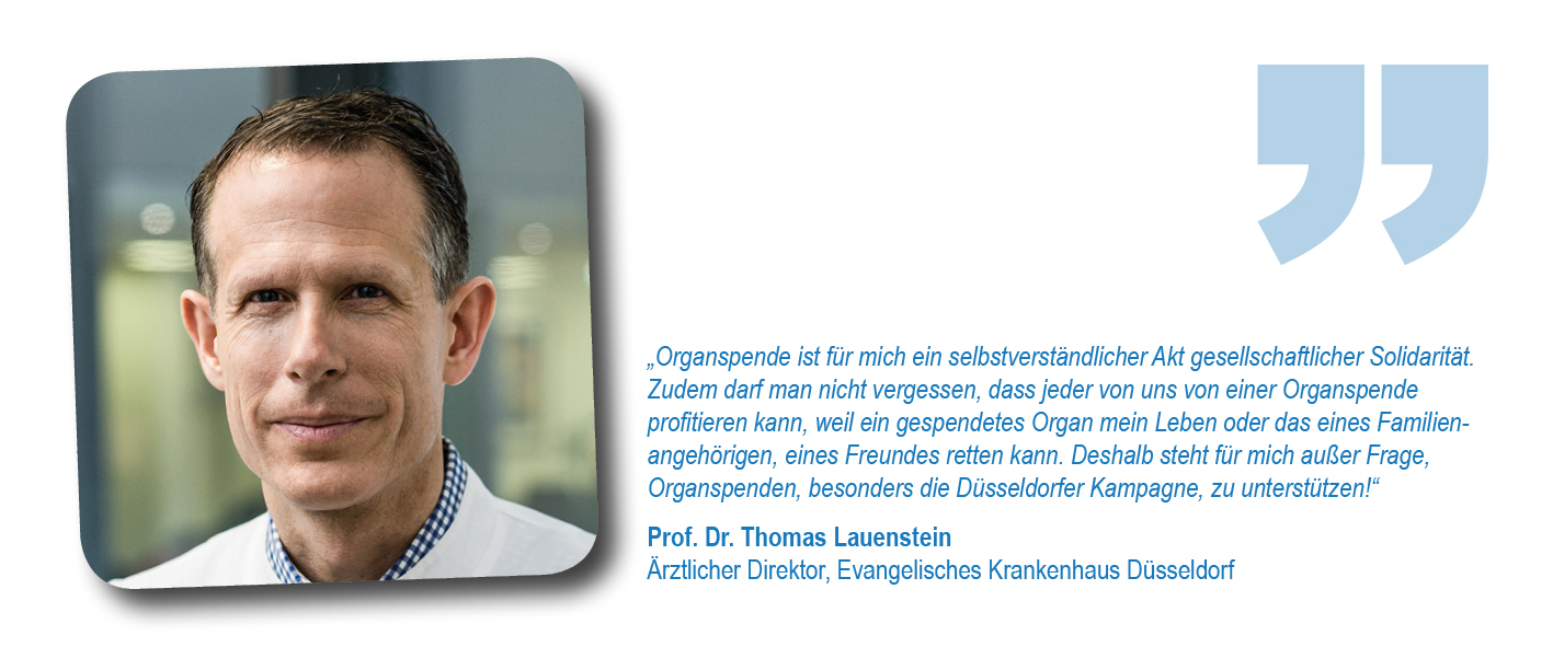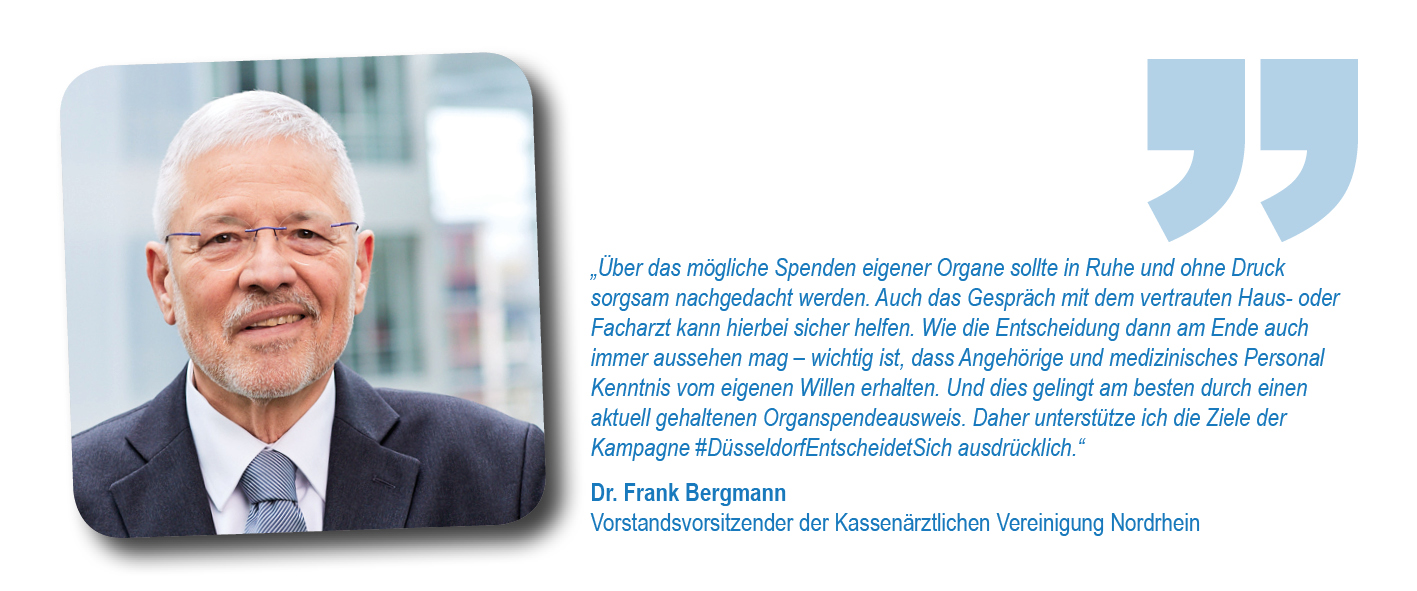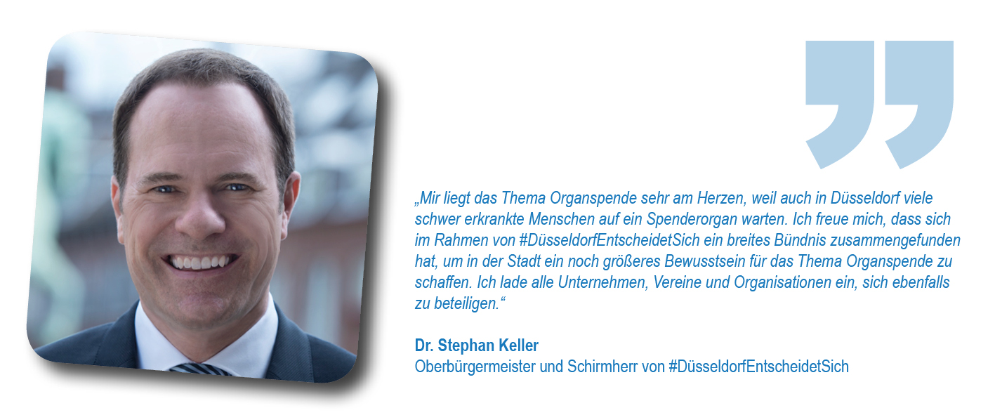 Als Initiatoren hatten sich Düsseldorfer Krankenhäuser, die Stadt Düsseldorf, die Deutsche Stiftung Organtransplantation (DSO) sowie das Netzwerk Organspende NRW e.V. zusammengetan, um im besten Fall die ganze Stadt davon zu überzeugen, eine Entscheidung zu treffen und diese im Organspendeausweis zu dokumentieren. Schirmherr war Düsseldorfs Oberbürgermeister Dr. Stephan Keller. Unterstützt wurde das Anliegen gleich zu Beginn von Initiativpartnern aus den Bereichen Medizin, Sport, Unternehmen und Brauchtum: der Kassenärztlichen Vereinigung Nordrhein, Borussia Düsseldorf, der Rheinbahn und dem Comitee Düsseldorfer Carneval.