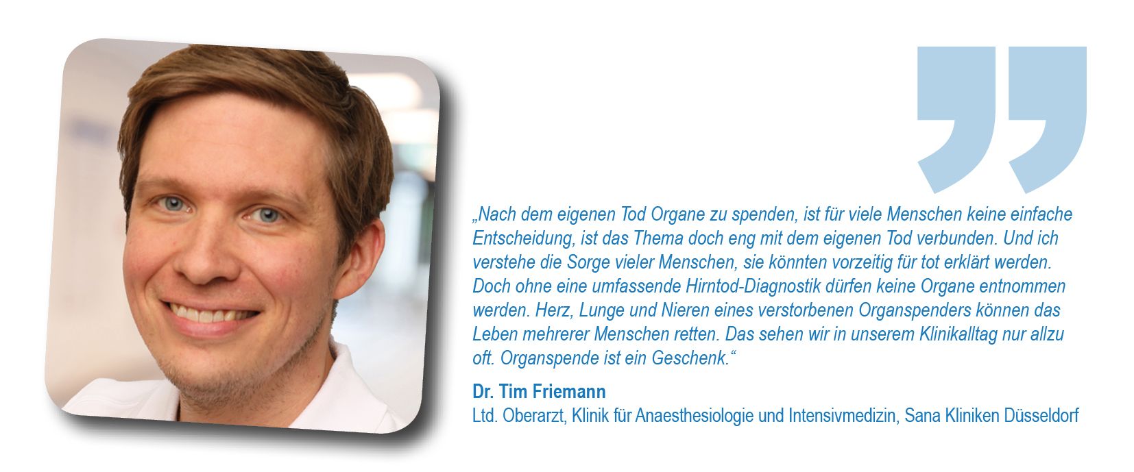 Ziel aller medizinischen Maßnahmen im Falle eines Unfalls oder einer schweren Erkrankung ist es, das Leben des Patienten zu retten. Die Bemühungen der Notärzte, Rettungsteams und Intensivmediziner sind allein auf dieses Ziel ausgerichtet. Manchmal kann der Patient trotz aller Bemühungen nicht mehr gerettet werden, Krankheit oder Unfallfolgen sind zu weit fortgeschritten. Mitunter tritt der Tod dabei durch den unumkehrbaren Ausfall der Gesamtfunktion des Großhirns, des Kleinhirns und des Hirnstamms ein; Kreislauf und Atmung können nur noch künstlich durch Beatmung und Medikamente aufrechterhalten werden. Nur bei dieser kleinen Gruppe von Verstorbenen stellt sich die Frage einer Organspende: Voraussetzung für die Organspende ist dabei immer, dass der Tod des Organspenders gemäß dem Transplantationsgesetz von zwei dafür qualifizierten Ärzten unabhängig voneinander nach den Richtlinien der Bundesärztekammer festgestellt worden ist. Diese Ärzte dürfen weder an der Entnahme noch an der Übertragung der Organe des Organspenders beteiligt sein, noch der Weisung eines beteiligten Arztes unterstehen.