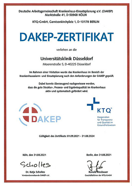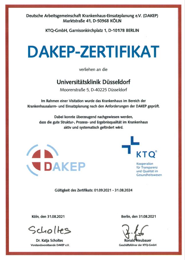 Berichte über Terroranschläge, Unfälle und sonstige Ereignisse zeigen uns immer wieder, dass plötzlich eine Vielzahl von Patienten gleichzeitig medizinisch versorgt werden muss. Dabei gilt es, bei diesen für das UKD externen Ereignissen, schnellstmöglich dem einzelnen Patienten bestmögliche medizinische Versorgung zukommen zu lassen. Ereignisse, wie Brände in Krankenhäusern, machen uns deutlich, welche verheerenden Folgen diese internen Gefahren haben können.