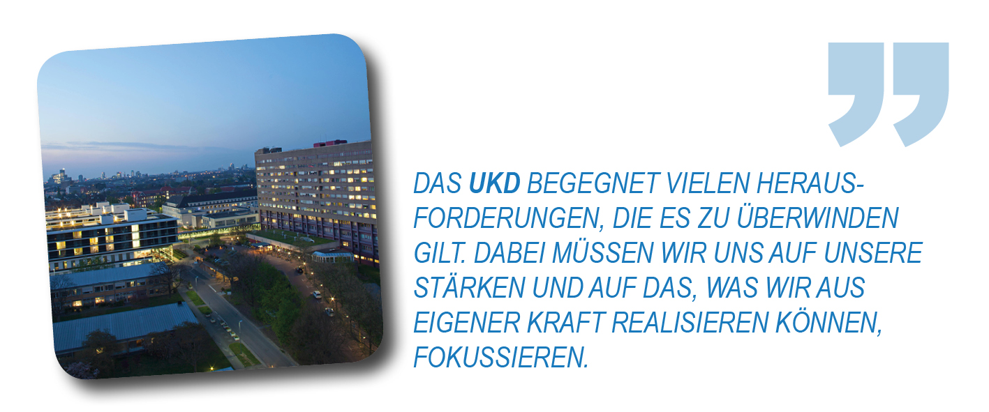 Profilschärfung, die Erhöhung der Arbeitgeberattraktivität, das Streben nach wirtschaftlicher Solidität, das Vorantreiben von Innovationen und gezielte Netzwerkbildung sind die zentralen Bestandteile der dem vorliegenden Strategiekonzept zugrundeliegenden Vision UKD 2030.