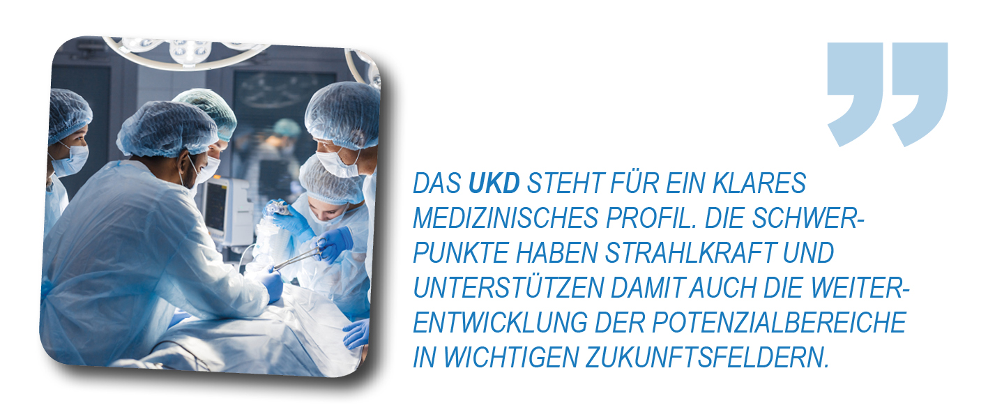 Umso mehr muss sich das UKD auf seine Stärken besinnen und diese auch in Zukunft zielgerichtet einsetzen und ausbauen, um ebendiesen Herausforderungen zu begegnen und sich resilient, zukunfts- und wettbewerbsfähig aufzustellen. Um in Düsseldorf nicht nur die Universitätsmedizin für die aktuelle, sondern auch die nächste Generation attraktiv und zukunftsfähig zu gestalten, soll sich das UKD 2030 als universitärer Maximalversorger mit einem national und international sichtbaren Profil etablieren, der als attraktivster Arbeitgeber im Gesundheitswesen in der Region wirtschaftlich erfolgreich ist, Innovationen vorantreibt und dabei als zentraler Akteur und Impulsgeber in Netzwerken agiert.