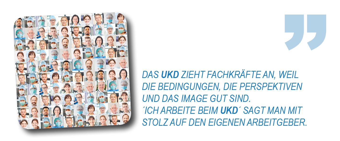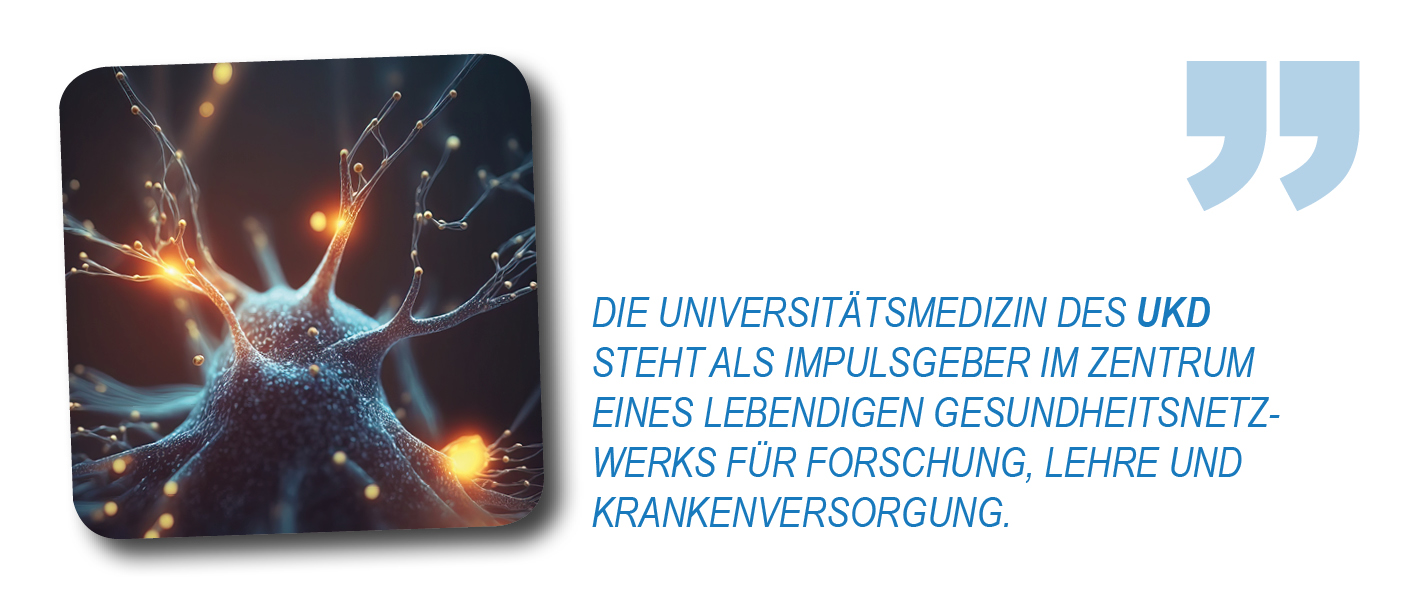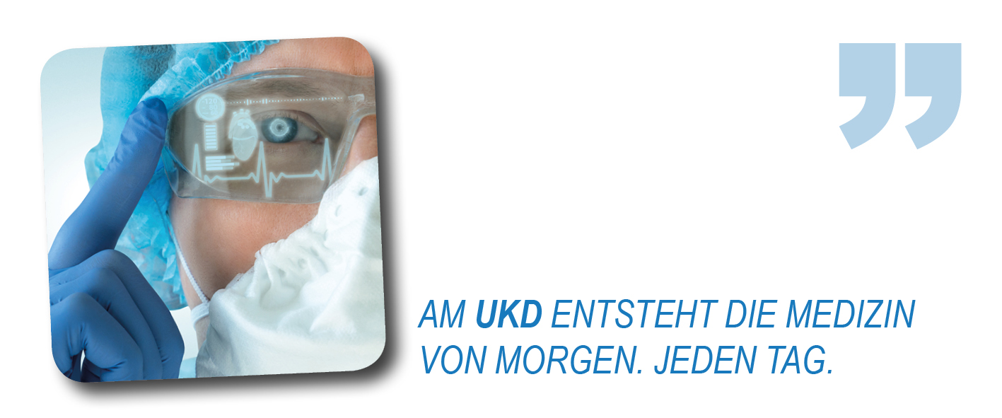 Im Jahr 2030 zeichnet sich das UKD als universitärer Maximalversorger mit einem national und international sichtbaren Profil aus, der als attraktivster Arbeitgeber im Gesundheitswesen in der Region wirtschaftlich erfolgreich ist, Innovationen vorantreibt und dabei als zentraler Akteur und Impulsgeber in Netzwerken agiert. So gestaltet das UKD universitäre Spitzenmedizin, nicht nur für die aktuelle, sondern auch die nächste Generation.