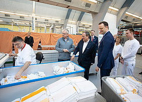 Ein besonderes Anliegen von Herrn Laschet und Herrn Spahn war es, den Medizinstudierenden zu danken, die sich bereits so zahlreich gemeldet haben, um das Klinikum in der Notsituation zu unterstützen. Über 450 stehen bereits auf einer Liste des UKD. Die beiden Politiker haben auch zwei Studierende von dieser Liste in der Wäscherei besucht, wo sie gerade helfen, das höhere Aufkommen an Wäsche zu bewältigen.