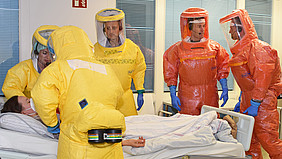 Für Rettungswagen, mit denen Patienten in die Isolierstation kommen, gibt es eine eigene Zufahrt in das Gebäude. Von dort aus gelangen die Patienten durch eine Sicherheitsschleuse auf die Sonderisolierstation. Die Mediziner und Pflegekräfte tragen während eines Ernstfalls spezielle Schutzanzüge und müssen nach jedem Kontakt mit dem Patienten unter die Sicherheitsdusche in der Dekontaminationsschleuse. Nach zwei Stunden Tätigkeit in der Einheit werden die Mitarbeiter abgelöst: Das Uniklinikum hält für einen möglichen Einsatz Personal und Mittel rund um die Uhr bereit.